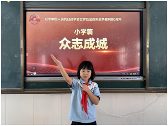 課堂上,歷史畫卷徐徐展開,將隊員們帶回烽火連天的歲月。隊員們屏息凝神,通過屏幕感受英雄們的錚錚誓言與壯烈事跡,清澈的目光中滿溢著對英雄的無限崇敬與捍衛(wèi)和平的堅定決心。在分享環(huán)節(jié),隊員們踴躍走上講臺,用稚嫩而真摯的聲音講述震撼人心的英雄故事,將抗戰(zhàn)精神化為可觸可感的種子,深深植根于心田。