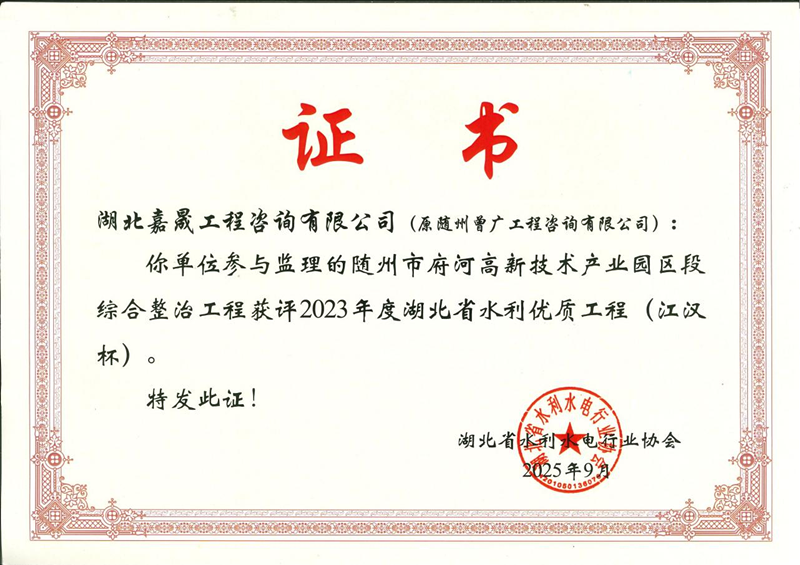 隨州產(chǎn)投集團(tuán)旗下嘉晟公司監(jiān)理項(xiàng)目榮獲省水利優(yōu)質(zhì)工程 “江漢杯”