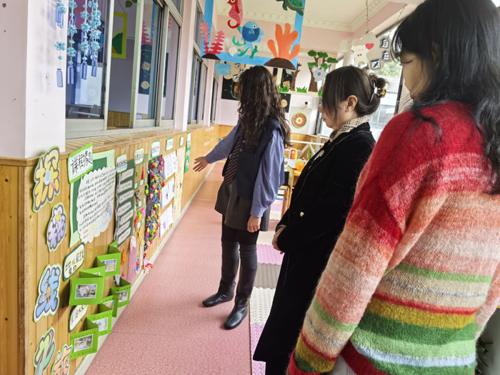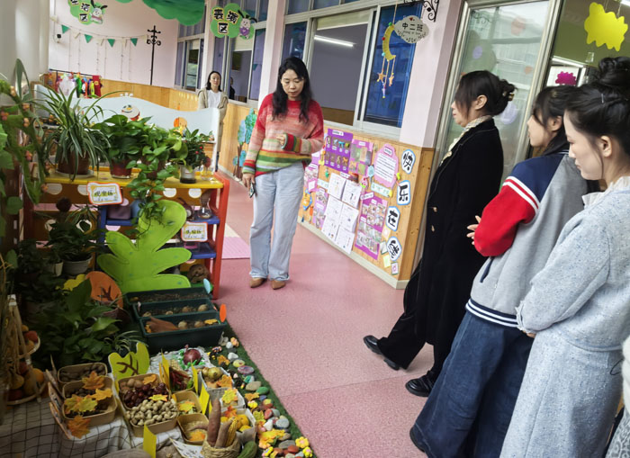 走進(jìn)各個(gè)班級(jí),仿佛步入了一個(gè)個(gè)色彩斑斕、充滿奇思妙想的童話世界。教師們化身為“魔法師”,將廢舊材料變廢為寶,讓每一面墻壁、每一個(gè)角落都“會(huì)說(shuō)話”。班主任從教育性、兒童性、藝術(shù)性、互動(dòng)性等多個(gè)維度,對(duì)本班環(huán)創(chuàng)理念與設(shè)計(jì)思路進(jìn)行了細(xì)致的闡述。教師們或駐足聆聽(tīng),或俯身細(xì)看區(qū)角設(shè)計(jì)的細(xì)節(jié),不時(shí)舉起手機(jī)拍照記錄下環(huán)創(chuàng)亮點(diǎn)。