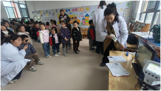 活動現(xiàn)場,在老師的有序引導下,孩子們排著整齊的隊伍,依次配合檢測。醫(yī)護人員熟練操作專業(yè)設備,細致為每一位幼兒檢查視力,同時用淺顯易懂的語言講解護眼小知識:“看電視要離遠一點,每天要多看看窗外的綠樹哦!”溫柔的互動不僅緩解了孩子的緊張感,更讓護眼意識悄悄扎根。