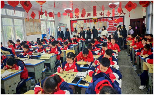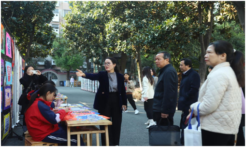 在成果展示環(huán)節(jié),與會人員首先觀看了紙韻童模表演,孩子們身著創(chuàng)意紙藝服飾,以靈動姿態(tài)展現(xiàn)藝術(shù)素養(yǎng)與動手能力;隨后走進剪紙藝術(shù)工作坊展區(qū),欣賞學(xué)生剪紙作品的同時,觀摩現(xiàn)場創(chuàng)作過程,感受傳統(tǒng)工藝與校園美育的融合;在書法展區(qū),教聯(lián)體各校學(xué)生優(yōu)秀書法作品陳列于報恩書院前,更有書法社團學(xué)生現(xiàn)場書寫,橫豎撇捺,篆隸行楷,翰墨飄香間盡顯扎實功底。走進書法實驗班,領(lǐng)導(dǎo)和同仁們驚訝于孩子的硬筆日常書寫水平之高,軟筆整班書法課中學(xué)生的書寫習(xí)慣和能力之強,這些成果也直觀呈現(xiàn)了學(xué)校書法教學(xué)的階段性成效。