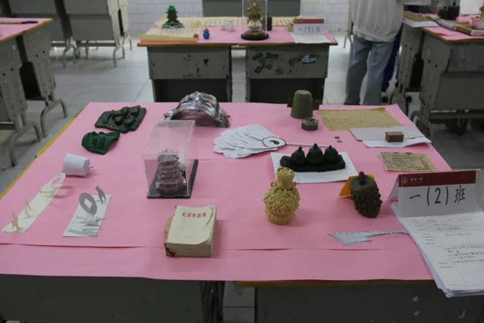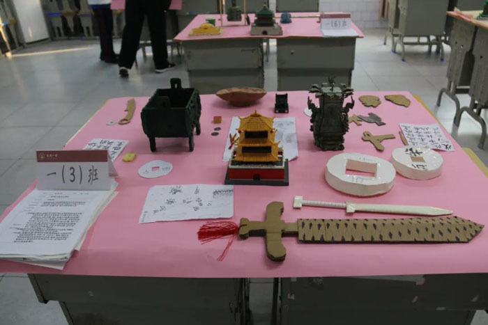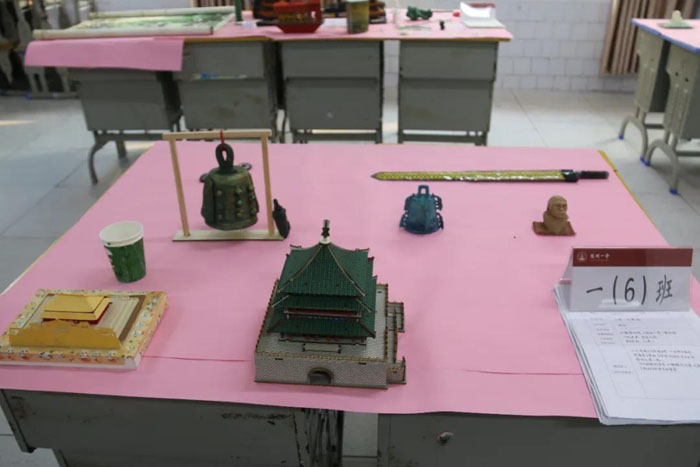 學(xué)生們通過查閱大量歷史資料和圖片,選擇自己感興趣的部分,使用陶泥、粘土、紙板或其他材質(zhì)的環(huán)保材料,采用雕塑、拼裝、剪裁、繪制等方法制作了建筑、文物、歷史遺跡、科技模型等各類作品。