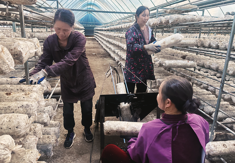 在石廟村香菇種植基地大棚內(nèi),村民們默契配合為碼放整齊的菇棒打孔。(全媒記者黃芳芳攝)