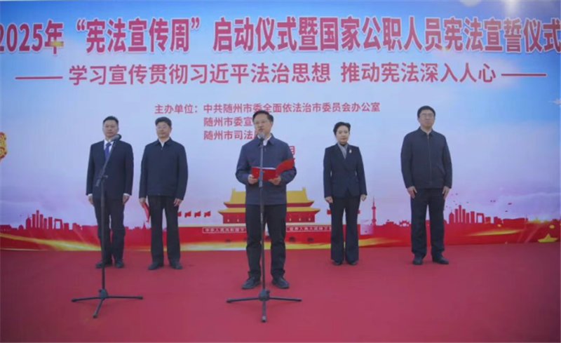今年12月4日是第十二個國家憲法日。12月3日,我市舉行2025年“憲法宣傳周”啟動儀式暨公職人員憲法宣誓儀式,啟動系列普法宣傳活動。市委副書記吳曉軍出席活動并強調,要深入學習貫徹黨的二十屆四中精神和習近平法治思想,奮力推進更高水平的法治隨州建設,引導社會各界尊法學法守法用法,為“整體提升環(huán)境 建功支點建設”營造更好法治環(huán)境。