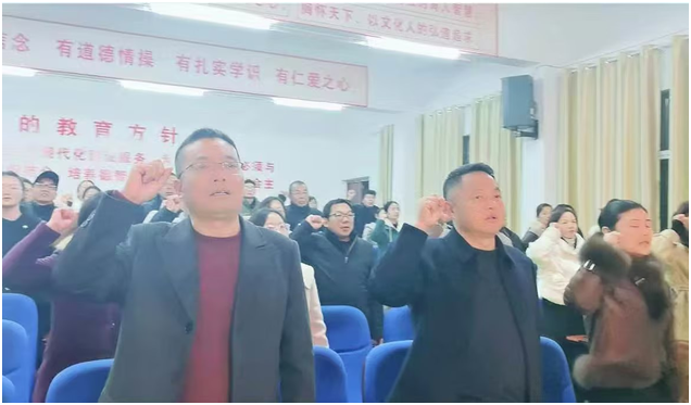 榜樣的力量催人奮進(jìn),誓言的初心更需銘記。在觀看完最美教師事跡后,活動進(jìn)入“錚錚誓言踐初心”集體宣誓環(huán)節(jié)。全體教職工起立,右手舉拳,莊嚴(yán)宣誓:“忠誠黨的教育事業(yè),貫徹黨的教育方針,履行教師神圣職責(zé),遵守教師職業(yè)道德……做有理想信念、有道德情操、有扎實(shí)學(xué)識、有仁愛之心的‘四有’好老師,為培養(yǎng)擔(dān)當(dāng)民族復(fù)興大任的時代新人而努力奮斗!”鏗鏘有力的誓言回蕩在會場,既是對教育使命的鄭重承諾,更將榜樣力量轉(zhuǎn)化為堅(jiān)守師德、潛心育人的堅(jiān)定決心。