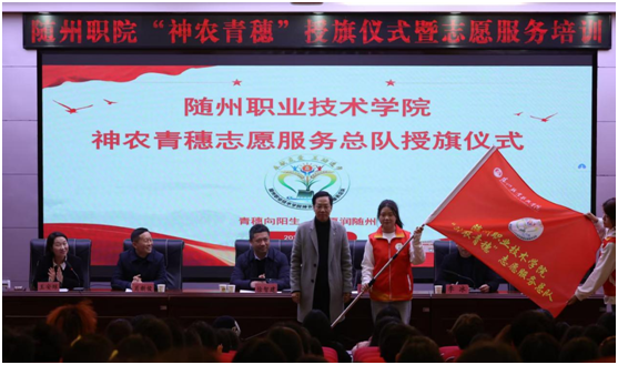 儀式上,校團(tuán)委組織宣傳科和社團(tuán)管理科相關(guān)負(fù)責(zé)同志宣讀了關(guān)于命名“神農(nóng)青穗”志愿服務(wù)總隊的決定和領(lǐng)學(xué)了隨州職業(yè)技術(shù)學(xué)院志愿服務(wù)工作條例(試行),為志愿服務(wù)規(guī)范化、制度化開展提供依據(jù)。據(jù)悉,總隊下設(shè)隨州職業(yè)技術(shù)學(xué)院“神農(nóng)青穗”紅石榴志愿服務(wù)隊、紅黃藍(lán)志愿服務(wù)隊、紅十字志愿服務(wù)隊、愛心汽車人志愿服務(wù)隊、白衣天使志愿服務(wù)隊、陌上花開志愿服務(wù)隊、信翼微光志愿服務(wù)隊、滿天星志愿服務(wù)隊、霞蹤旅韻志愿服務(wù)隊、菇勇者志愿服務(wù)隊、萌藝志愿服務(wù)隊等12支分隊。