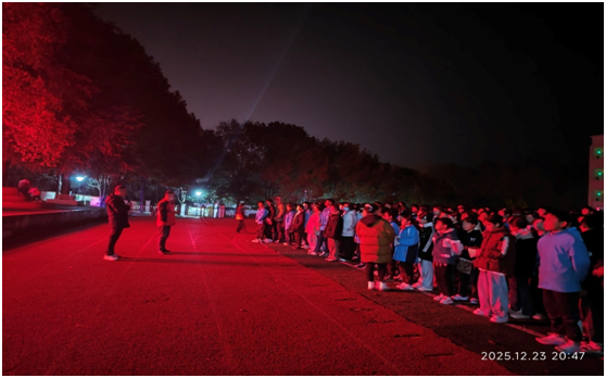 本次演練嚴格按照學(xué)校制定的夜間消防疏散演練預(yù)案和方案有序推進。演練信號發(fā)出后,全校教職工迅速到崗,履行引導(dǎo)疏散職責(zé)。教學(xué)樓內(nèi)的八、九年級學(xué)生,以及宿舍樓內(nèi)的六、七年級學(xué)生,在演練疏散引導(dǎo)組人員的指揮下,彎腰低姿、捂住口鼻,沿著預(yù)定疏散路線快速、有序地向運動場安全區(qū)域撤離。整個演練過程用時2分36秒,疏散時緊張而不慌亂,師生們動作規(guī)范、配合默契,高效完成了撤離集結(jié)任務(wù)。