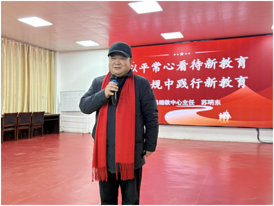 蘇明東圍繞“以平常心看待新教育,在常規(guī)中踐行新教育”這一主題發(fā)表了指導(dǎo)講話。他以其對(duì)區(qū)域教育的深刻洞察,從四個(gè)方面為基層教師消除了思想與實(shí)踐的顧慮:一是闡明新教育并不神秘,其核心是回歸教育本真、關(guān)注生命成長;二是強(qiáng)調(diào)新教育并不可怕,鼓勵(lì)教師從一小步開始嘗試,在行動(dòng)中理解;三是指出新教育不是額外負(fù)擔(dān),關(guān)鍵在于與現(xiàn)有常規(guī)工作的有機(jī)融合、增效提質(zhì);四是指導(dǎo)新教育的校本化實(shí)踐,要求各校結(jié)合自身實(shí)際,找到切入點(diǎn),創(chuàng)造性地推進(jìn)。他的講話既是對(duì)理念的高位引領(lǐng),也充滿了對(duì)基層實(shí)踐的理解與支持,為長崗新教育扎實(shí)落地提供了務(wù)實(shí)而富有智慧的方法論,充分體現(xiàn)了上級(jí)對(duì)鄉(xiāng)鎮(zhèn)學(xué)校穩(wěn)步發(fā)展的殷切關(guān)懷與持續(xù)幫扶。