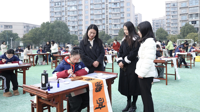 比賽分三場依次推進。開賽指令一經(jīng)發(fā)出,操場頃刻歸于寧靜。硬筆區(qū)域師生凝神運筆,端莊工整;軟筆區(qū)域墨香裊裊,氣韻流動。其間,不少家長暖心協(xié)助,扶紙?zhí)砟,溫情洋溢。書寫結束后,師生手持作品合影留念,工作人員有序完成作品收集與整理。