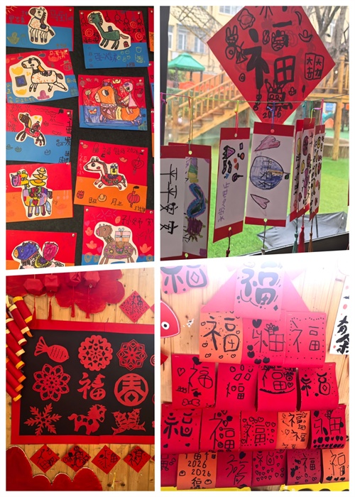 教室里,溫馨的畫面映入眼簾。孩子們在老師的帶領(lǐng)下忙得不亦樂乎:制作鞭炮、寫對聯(lián)、畫彩馬,貼福字,一雙雙小手專注又靈巧!翱!這是我們班小朋友貼的福!”稚嫩的話語里滿是自豪。就連小班的寶寶們也不甘示弱,忙著粘果果、拓福畫,將教室裝扮一新。這些手工活動,不僅鍛煉了孩子們的動手能力,更讓他們在親身參與中理解了新年習(xí)俗的文化內(nèi)涵。