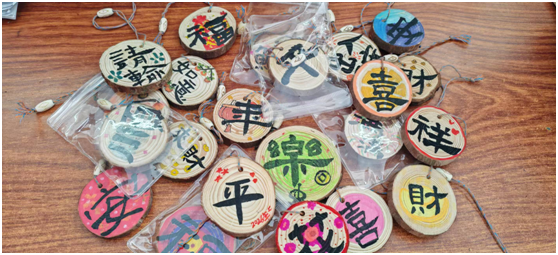 在木質(zhì)掛牌和紙質(zhì)扇面上,同學(xué)們揮毫?xí)鴮憽扒俺趟棋\”“萬事順遂”“闔家幸!钡茸8T捳Z,一筆一劃間盡顯認真,稚嫩的筆觸里藏著對新年的憧憬。
