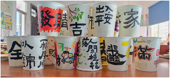 活動中,同學(xué)們化身“小小書法家”,在老師的指導(dǎo)下,用毛筆、馬克筆等工具,將新年的美好期許融入書法創(chuàng)作。在紙杯上,他們寫下“平安”“吉祥”“發(fā)財”等喜慶字樣,搭配五彩的繪畫裝飾,普通的紙杯變成了獨具韻味的新年文創(chuàng)。